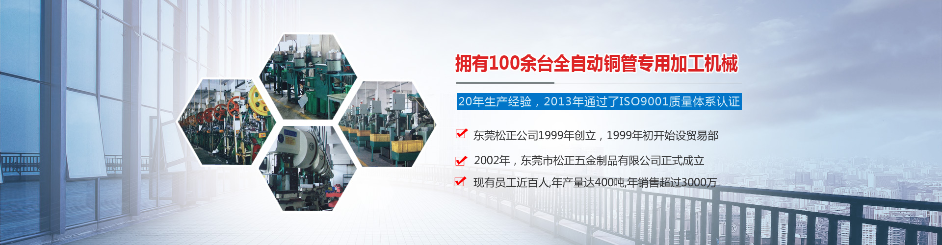 東莞松正公司1999年創(chuàng )立,1999年初開(kāi)始設貿易部,至2002年,東莞市松正五金制品有限公司正式成立。我公司專(zhuān)業(yè)從事銅管/鋁管/ 不銹鋼管、制造、研發(fā),累積了近20年的先進(jìn)生產(chǎn)經(jīng)驗,已于2013年6月通過(guò)了ISO9001質(zhì)量體系認證。 公司現共有員工近百人,年產(chǎn)量達到400噸,年銷(xiāo)售超過(guò)3000萬(wàn).公司共設有7個(gè)職能部門(mén),分門(mén)別類(lèi)處理各項日常事務(wù),為方便溝通,還特設有總經(jīng)理信箱,員工有任何建議和意見(jiàn)均可由此向總經(jīng)理反應. 在硬件設施方面,公司現擁有全自動(dòng)銅管專(zhuān)用加工機械近壹百多臺和專(zhuān)業(yè)的檢測備,具有較強的生產(chǎn)和檢測能力。舉凡外徑在0.30mm~.....